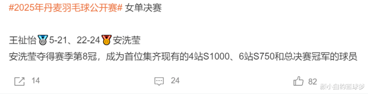 安洗莹刚刚在丹麦拿到了赛季第八冠,成为首位集齐4站S1000/6站S750、总决赛冠军的球员,她依旧是王祉怡最大的拦路虎。